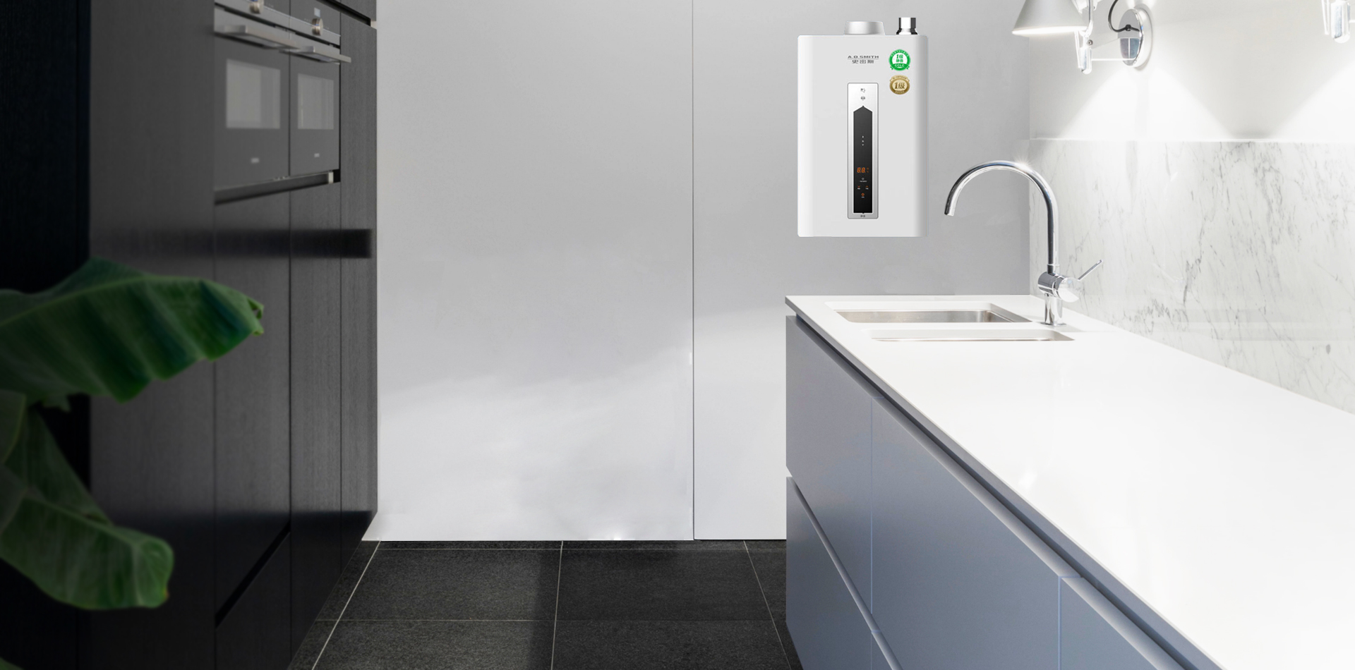 位于室外管道井內,巧妙利用空間,選用了A.O.史密斯EES-40B型落地式家庭中央熱水器新一代全產權、